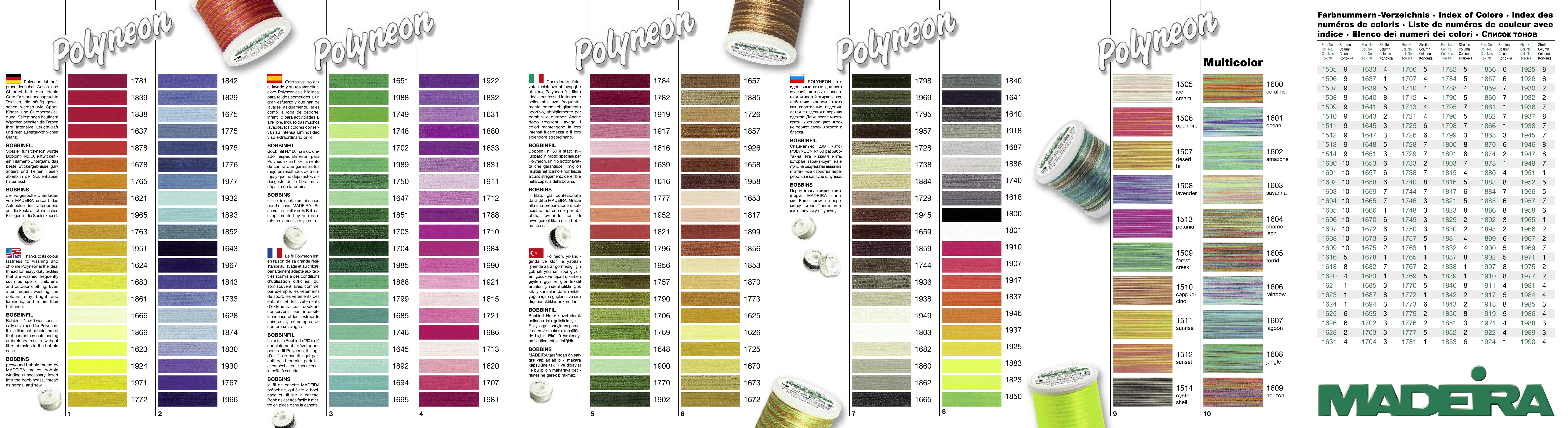 Pokud má výšivka přetrvat časté praní a setkávání se s chlórem, Polyneon je ta správná volba. Tato nit je ideální pro výšivky na oděvy pro práci, sport a volný čas, froté materiály, stejně tak i pro prostírání. Používá se pro šití i vyšívání.